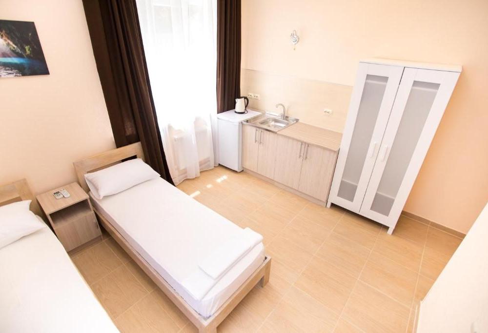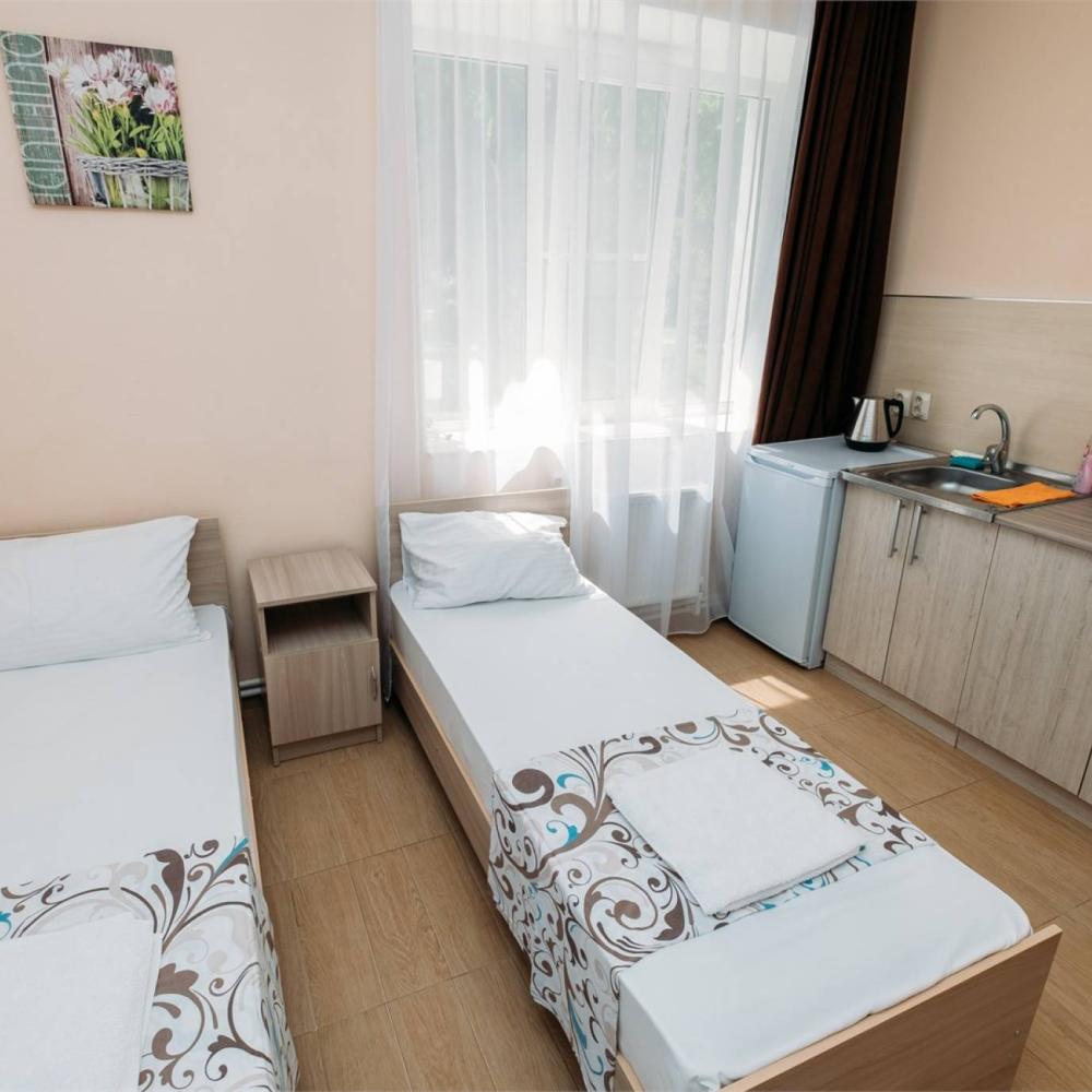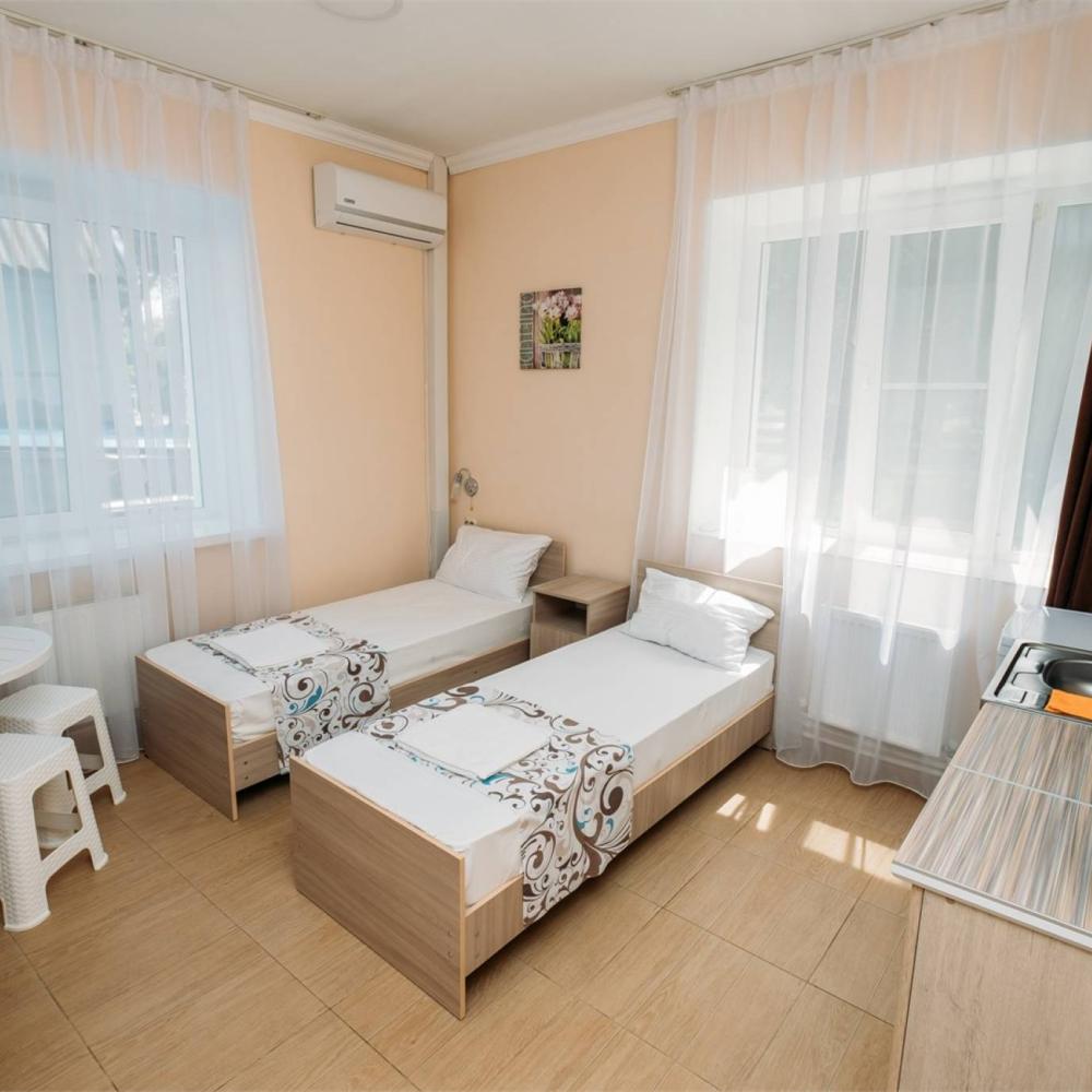 Одна большая кровать или две односпальных, сплит-система, телевизор, холодильник, мини-кухня, чайник, посуда, стол, стулья, шкаф, две тумбочки, входная группа, сан. узел с душевой.