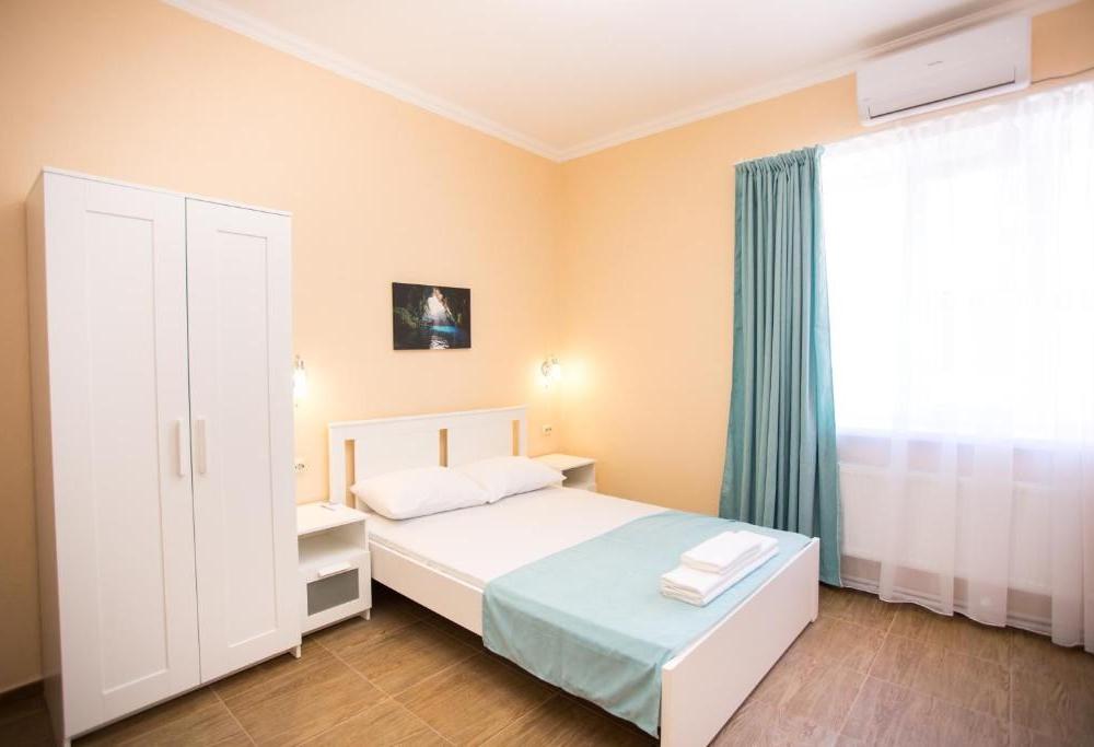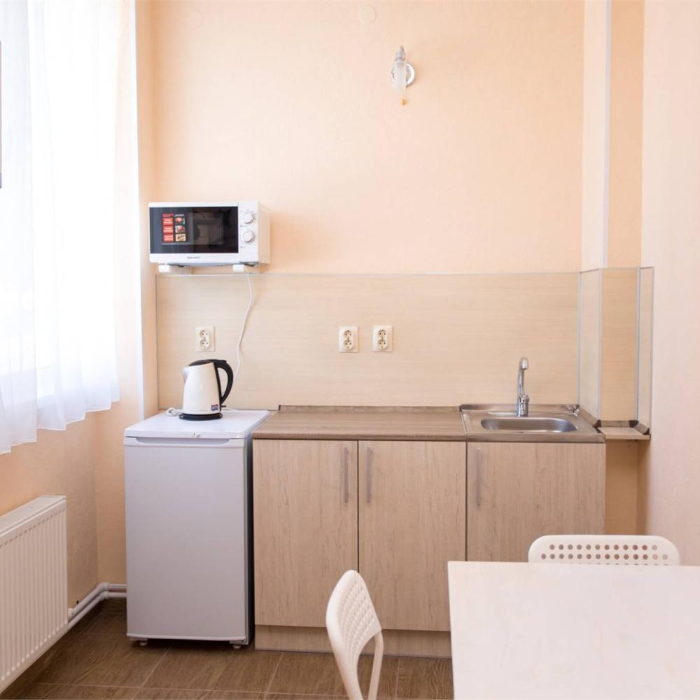 Две изолированные комнаты, в одной мини-кухня, чайник, микроволновка, посуда, диван полутороспальный (раскладывается), стол, стулья, телевизор. В другой одна двуспальная кровать, две тумбочки, шкаф, комод, входная группа, телевизор. На эти две комнаты сан. узел с душевой и сплит-система.
